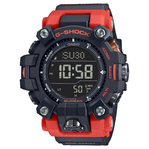 Erkunde weiteres Gelände mit verbesserter Unterstützung: Ein robuster Zeitmesser in einem kühnen und leistungsstarken Dreifachsensor-Design. Die G-SHOCK Master of G-Uhrenlinie wurde für Profis entwickelt, die in den härtesten Umgebungen arbeiten. Dazu gehört auch die MUDMAN mit drei Sensoren und schlammresistenter Konstruktion. Der große und einfach zu bedienende Frontknopf und die drei direkten Sensorknöpfe an der Seite sind so geformt, dass sie Schlamm und Wasser ableiten und durch zylinderförmige Edelstahlteile geschützt sind. Die Knopfwellen sind mit Dichtungen ausgestattet, um Schlamm und Staub fernzuhalten, so dass du auch für das härteste Terrain gerüstet bist. Das kühne Design verfügt über eine LCD-Anzeige mit zwei Ebenen sowie einen Triple Sensor, der Höhe, Richtung, Temperatur und Luftdruck direkt an dein Handgelenk liefert. Das dünne Modul und die Carbon Core Guard Struktur sorgen dafür, dass all diese Funktionen in einer schlankeren, kompakteren Uhr untergebracht sind, die robust und widerstandsfähig ist und bequem sitzt. Dieses schlanke, aber leistungsstarke MUDMAN Design liefert umfassende Funktionalität in einem auffälligen Äußeren, das aus einer ausgeklügelten Kombination von Komponenten besteht. Der digitale Kompass ist praktischer als je zuvor dank der LCD-Anzeige mit zwei Ebenen, die auf der oberen Schicht Kompassgrafiken und auf der darunter liegenden Schicht die Uhrzeit und andere Messwerte anzeigt. Die GW-9500-3 und die GW-9500-1A4 verfügen über eine negative LCD-Anzeige mit zwei Ebenen. Die funkgesteuerte Solarenergie liefert eine präzise Zeitmessung durch Licht, während der Super Illuminator für gute Sichtbarkeit sorgt, selbst an dunklen Orten. Das Gehäuse, die Lünette und das Urethan-Armband sind aus biobasierten Harzen hergestellt, die aus erneuerbaren organischen Ressourcen gewonnen werden. Auf der Rückseite des Gehäuses ist die legendäre MUDMAN Maulwurffigur mit einem Kompass eingraviert.