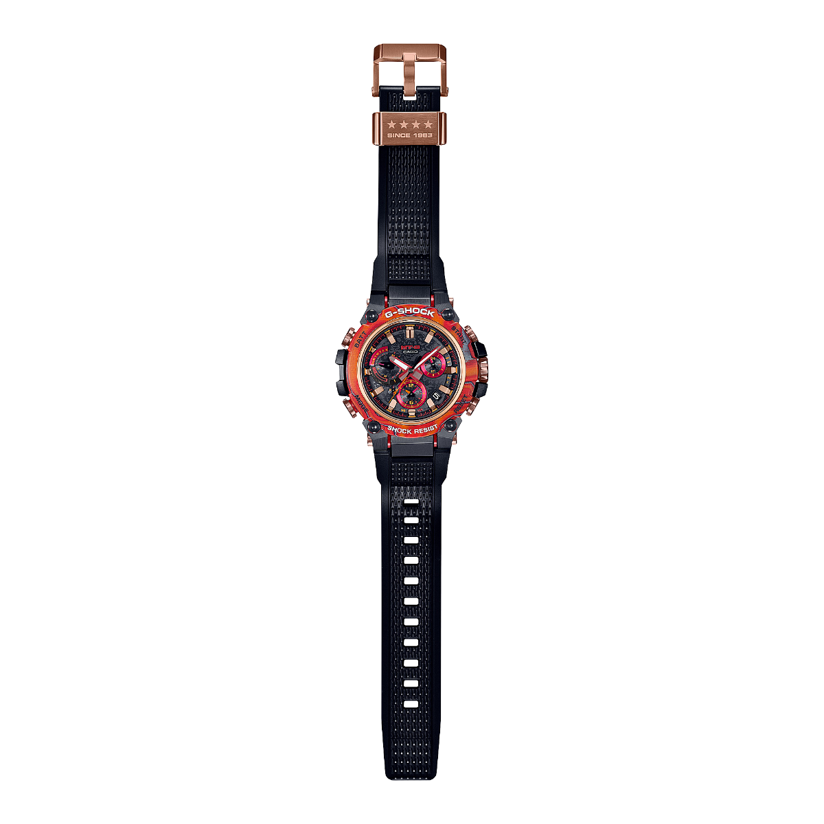 Wir stellen vor: Die 40th Anniversary G-SHOCK Flare Red Modelle – Zwei limitierte Zeitmesser in feurigem Rot anlässlich des 40. Geburtstags der ersten G-SHOCK, die 1983 auf den Markt gebracht wurde. Inspiriert von der Intensität einer Sonneneruption: Die Modelle MTG-B3000FR und GWG-2000FR sind in den für G-SHOCK charakteristischen Farben Schwarz und Rot gehalten und verfügen über die neuesten Technologien von Casio. Eine mehrfarbige Lünette mit Karbon-Einsatz, die aus Schichten von Karbon- und Glasfaserplatten mit phosphoreszierenden Partikeln besteht, erinnert an die explosive Kraft der Sonne und sorgt für ein außergewöhnliches Design, das im Dunkeln leuchtet. Die Lünetten Komponenten mit individuellen und einzigartigen Mustern – keines wiederholt sich – ergeben unvergleichliche, leichte und doch robuste Uhren. Das Lünetten Design der GWG-2000 besteht sogar aus geschmiedeten Karbonfasern mit phosphoreszierenden Partikeln und passt somit perfekt zu der Lünette mit den im Dunkeln leuchtenden Sonneneruptionsmustern. Beide Modelle verfügen neben der besonderen Lünette über ein von Eric Haze für das 40. Jubiläum von G-SHOCK entworfenes Logo, das auf der Gehäuserückseite eingraviert ist. Zudem sind vier Sterne auf der Armbandschlaufe eingraviert, die für 40 Jahre stehen. Diese wunderschönen, einzigartigen und eindrucksvollen Zeitmesser sind ideal, um das 40. Jubiläumsjahr von G-SHOCK zu starten.